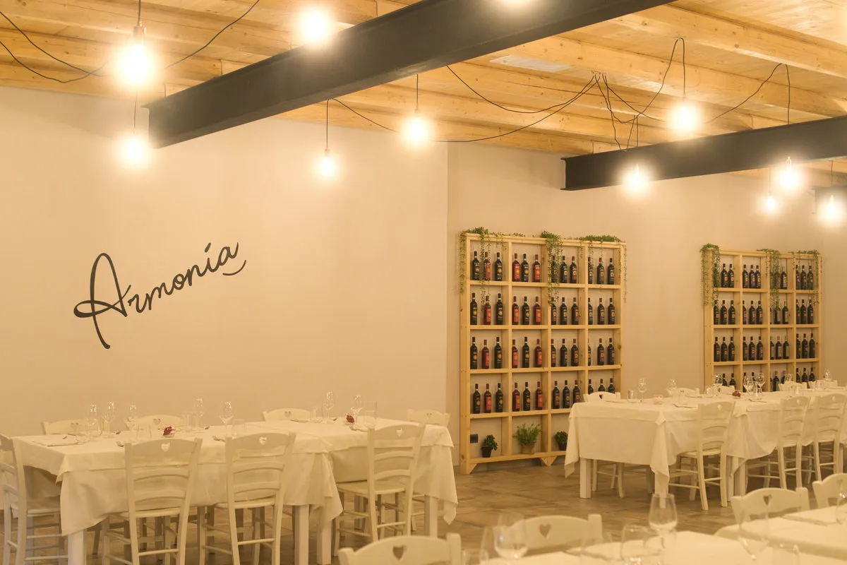 Immergiti nella calda atmosfera della sala principale di Armonia Treville, una dimora di gusto ricavata dalla bottaia di un'antica cantina. Qui, le antiche volte in mattoni si fondono con un design che omaggia la tradizione senza rinunciare a comfort e modernità. Le pareti in pietra, testimoni di un passato ricco e solido, accolgono ora conversazioni, risate e brindisi di chi cerca un'esperienza autentica e di qualità.